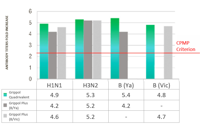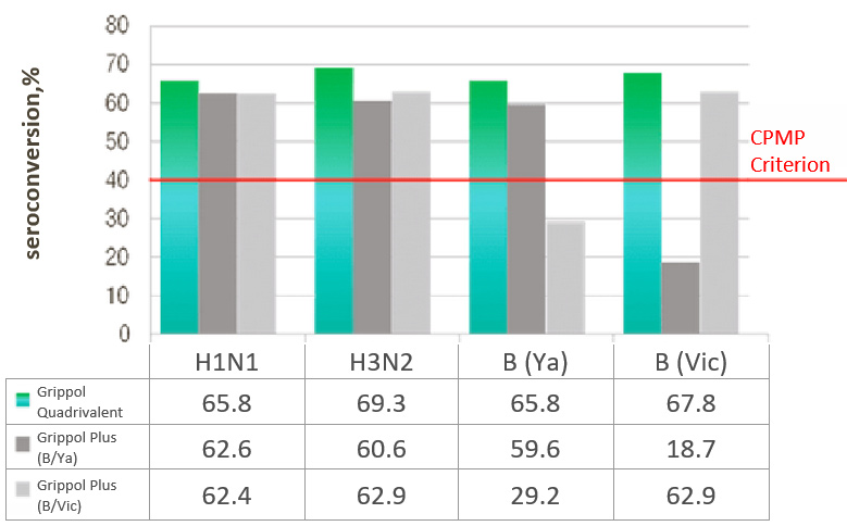 - Immunogenicity of Grippol® Quadrivalent meets EMA CPMP criteria for all 4 strains of influenza virus2