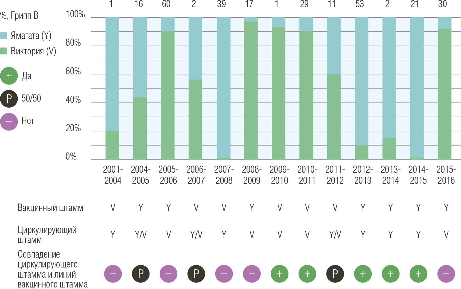 В ряде сезонов циркулировали обе линии вируса гриппа В (Ямагата и Виктория).